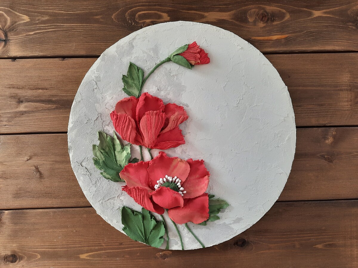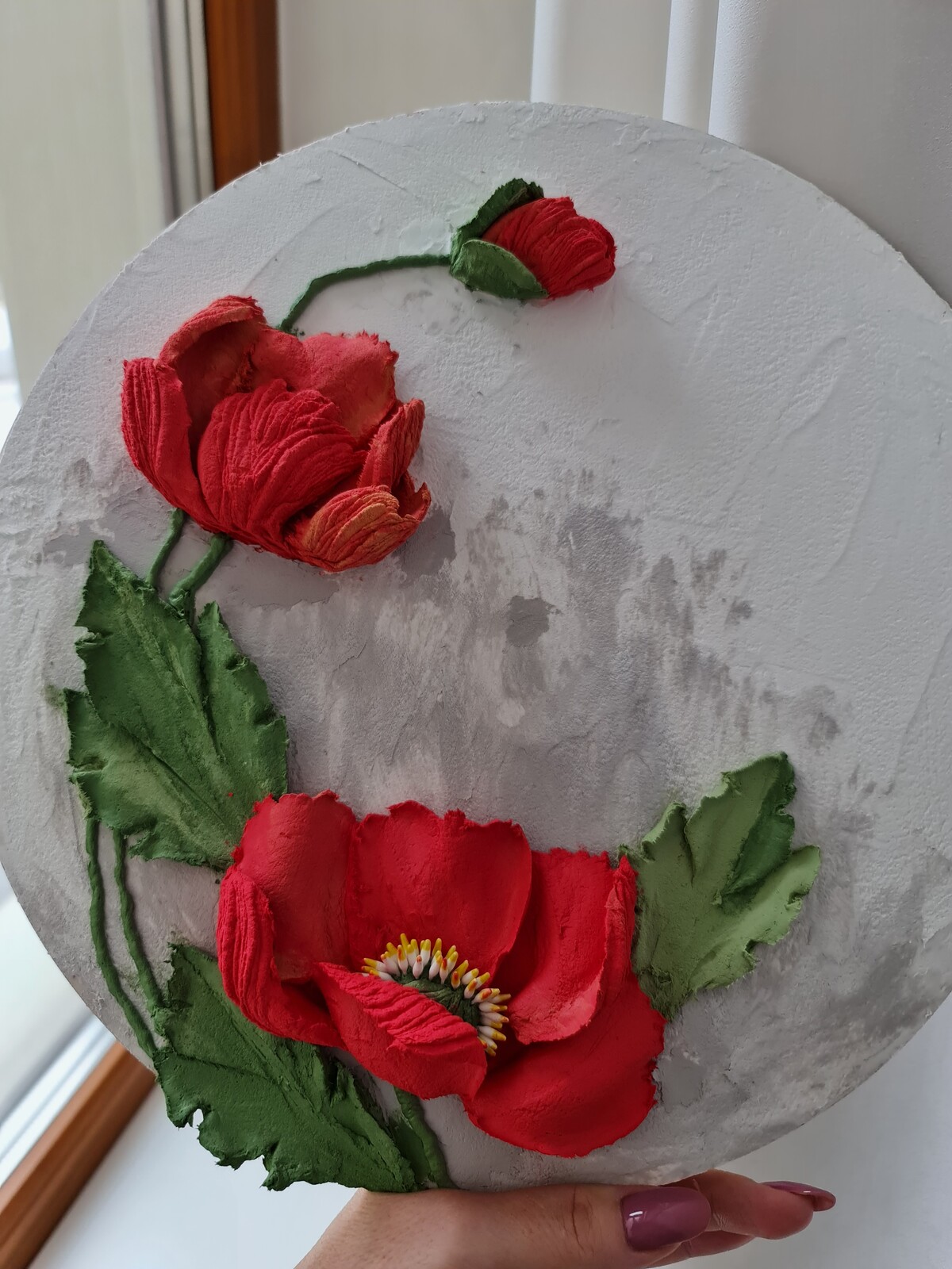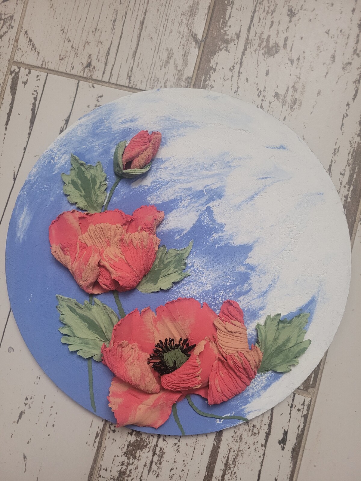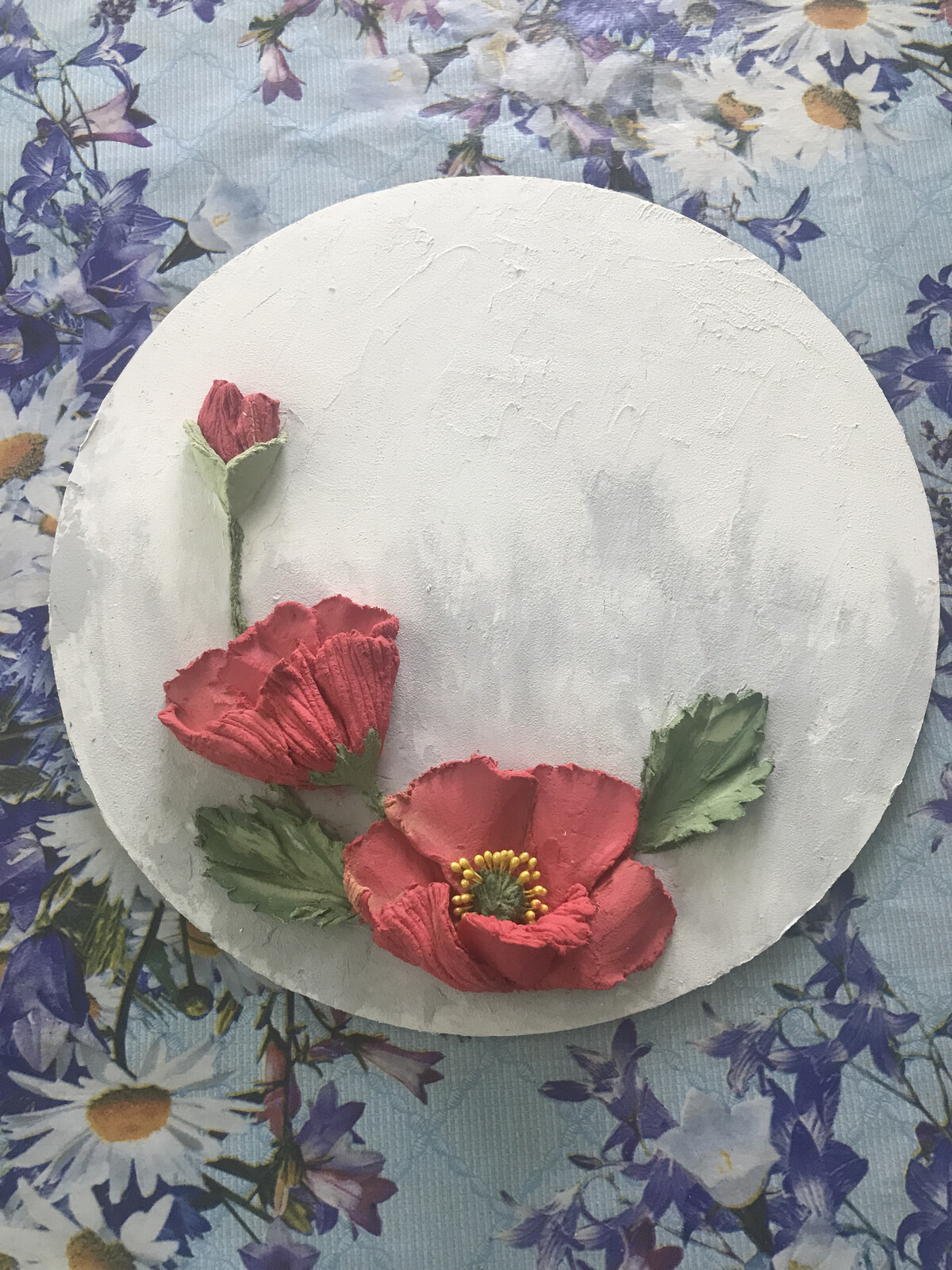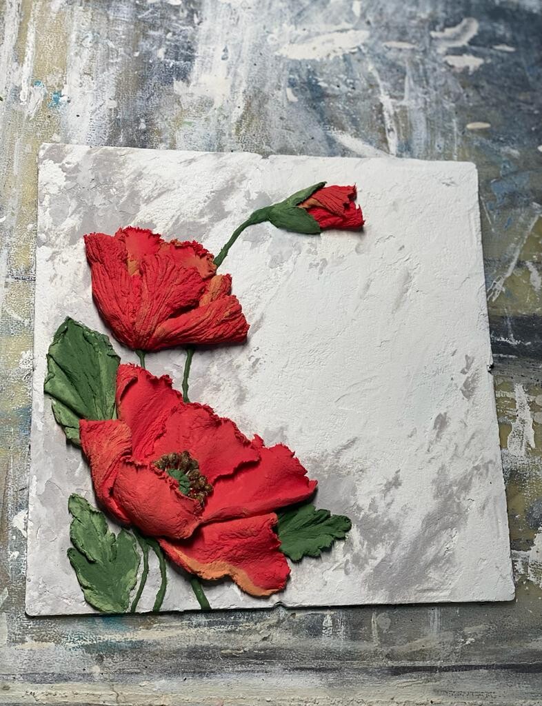 За несколько небольших уроков, мы создадим панно, представленное на изображении, научимся создавать объемные цветы мака в нескольких видах, стебли и листья и поймем, что скульптурной живописи может научиться абсолютно каждый.