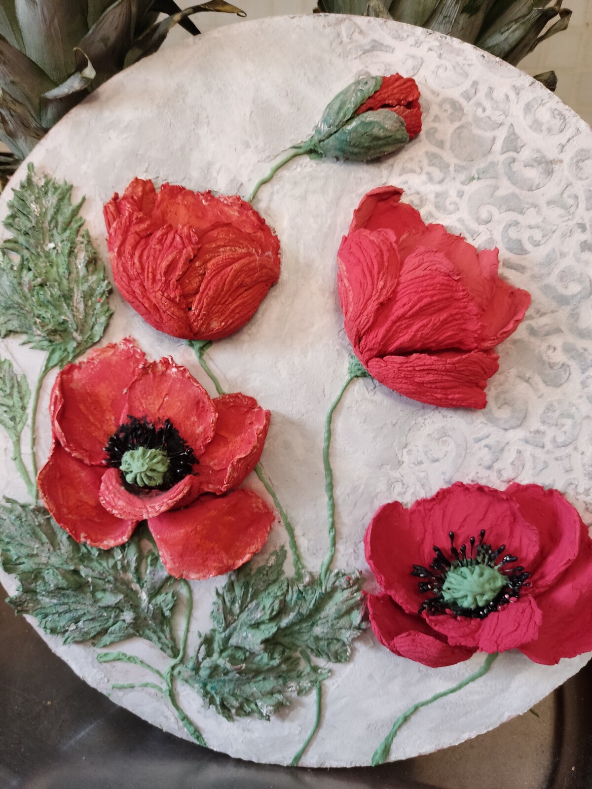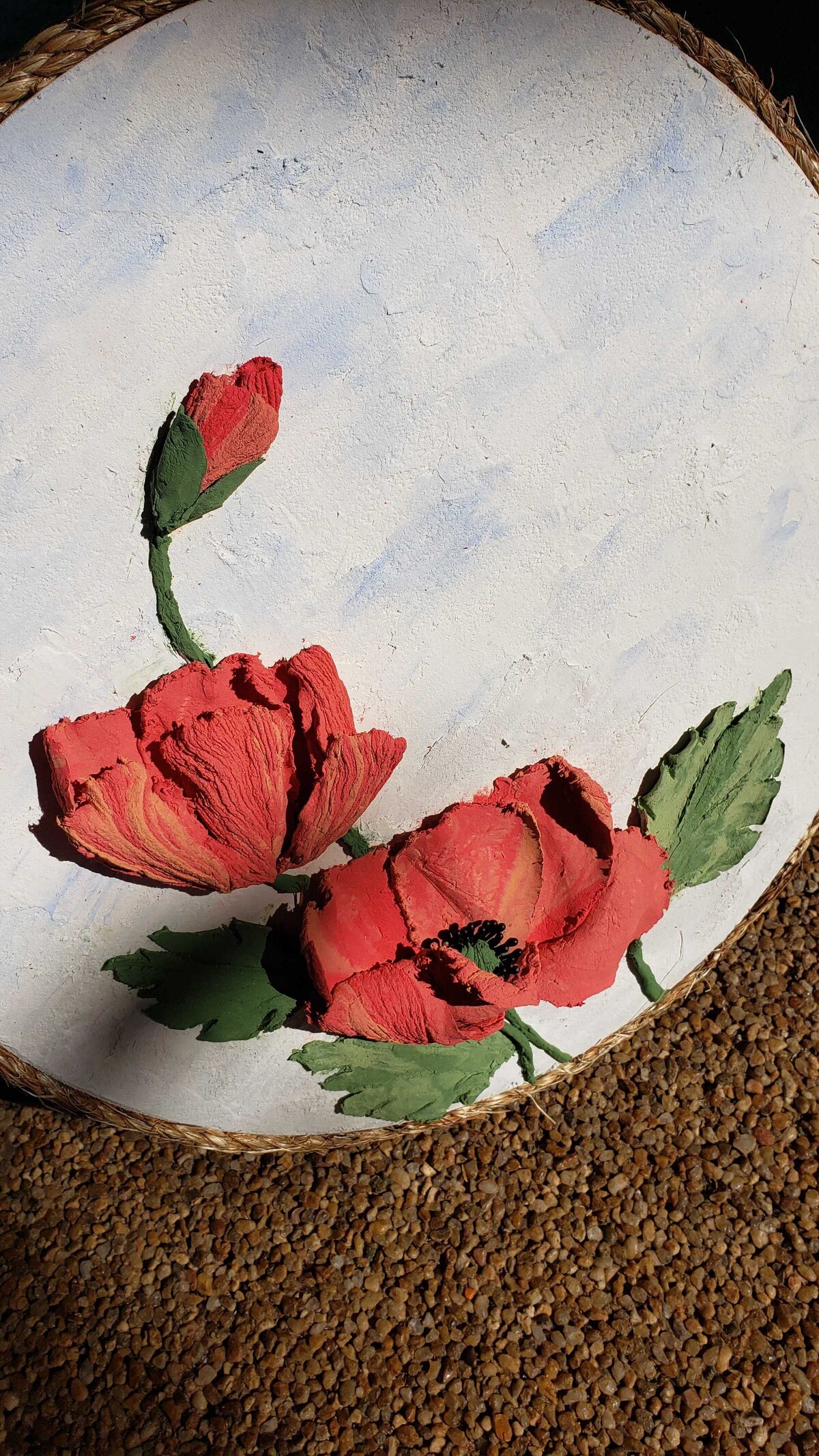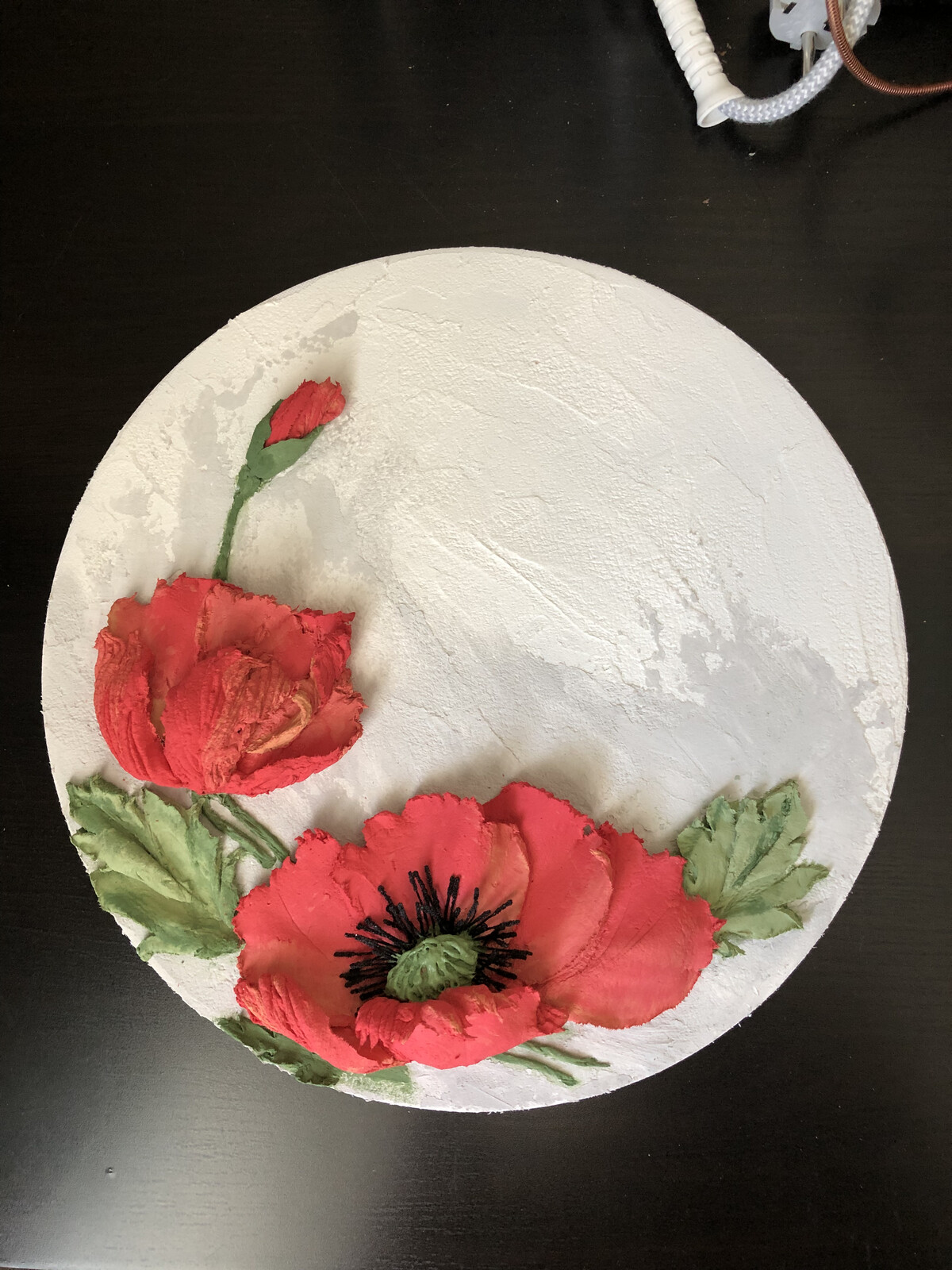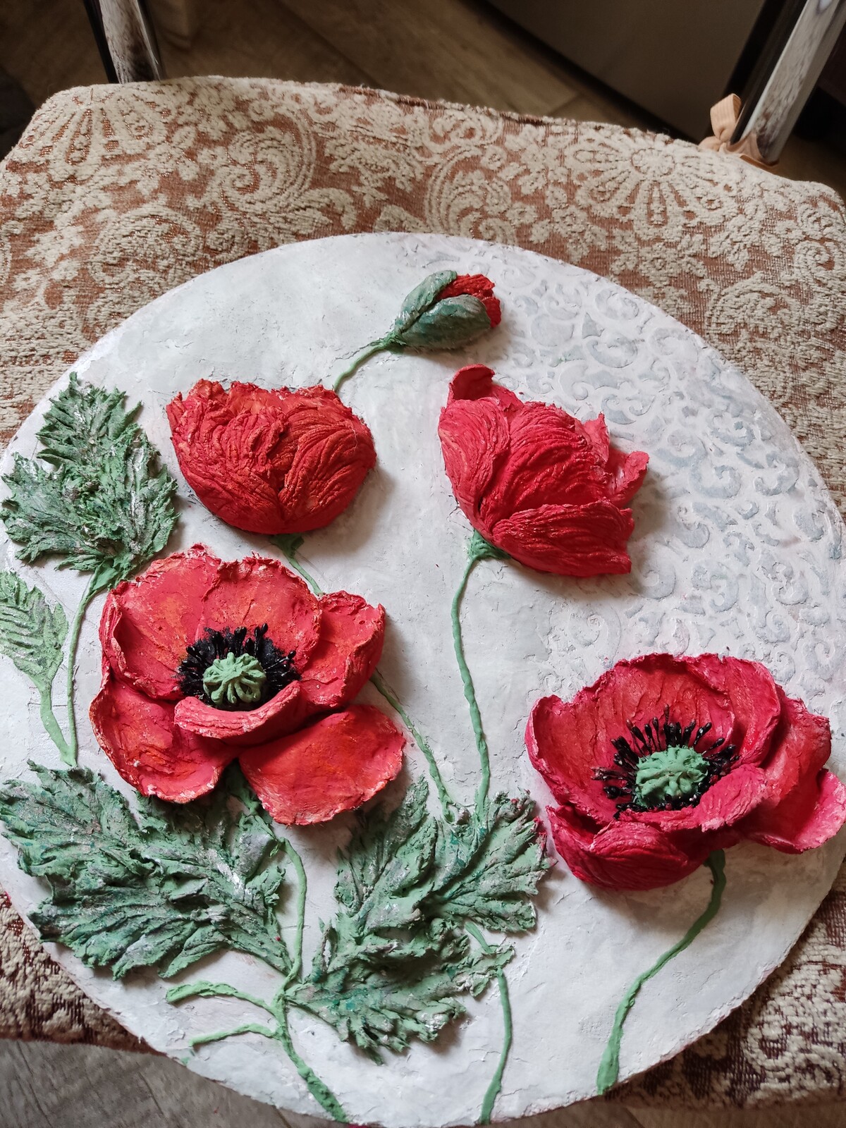 За несколько небольших уроков, мы создадим панно, представленное на изображении, научимся создавать объемные цветы мака в нескольких видах, стебли и листья и поймем, что скульптурной живописи может научиться абсолютно каждый.