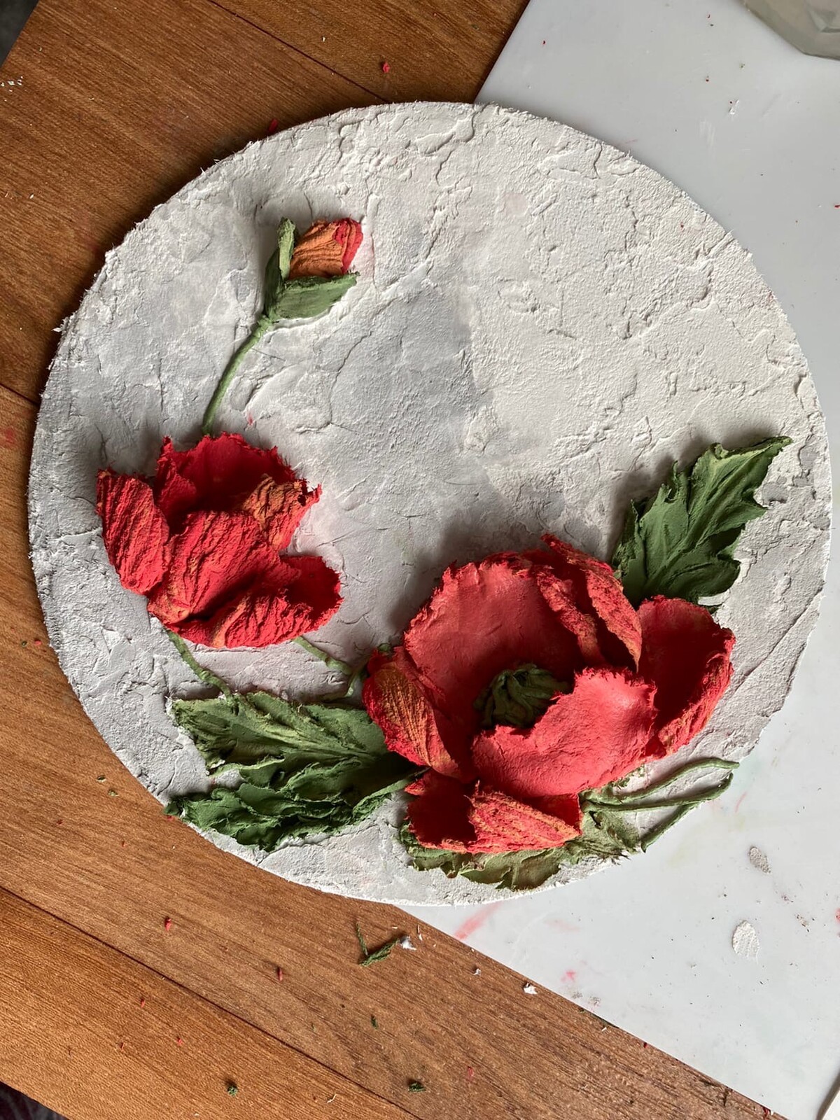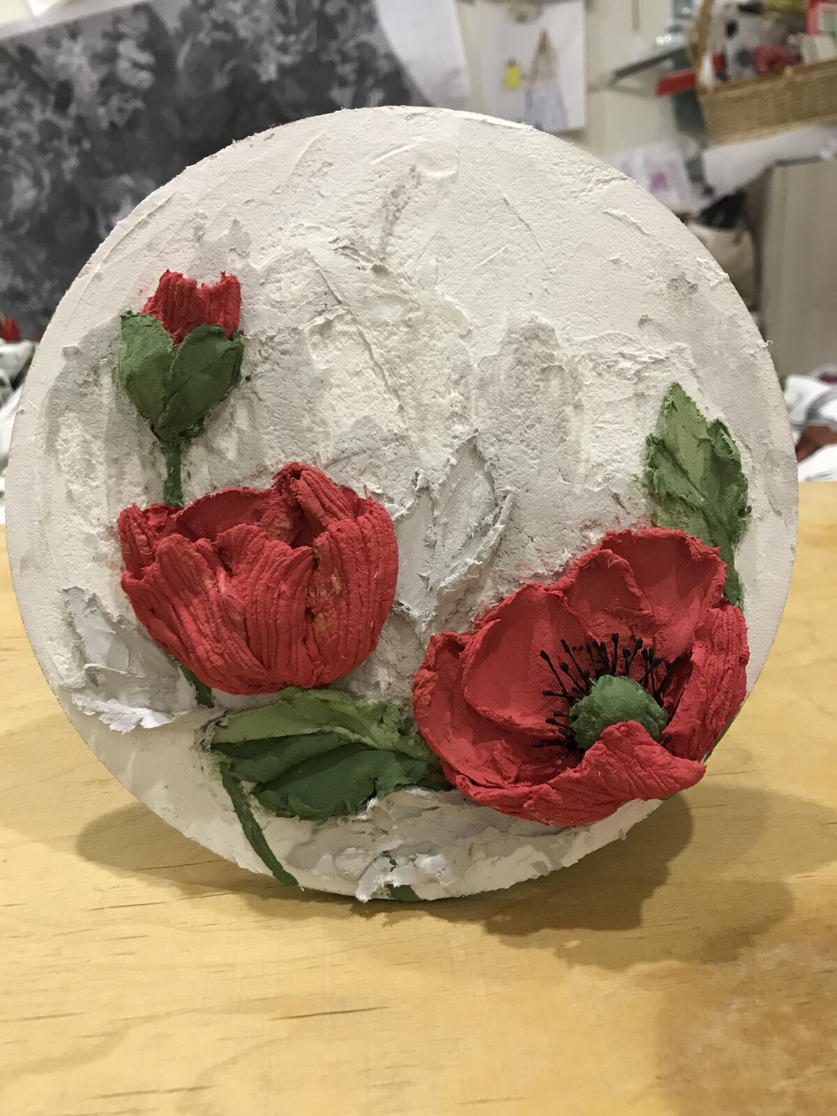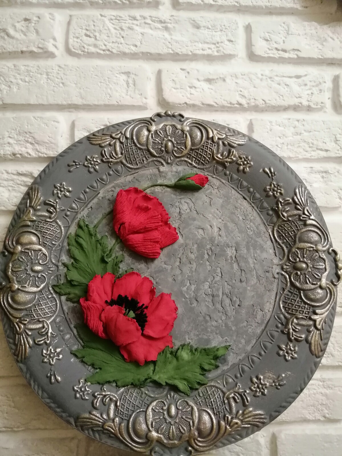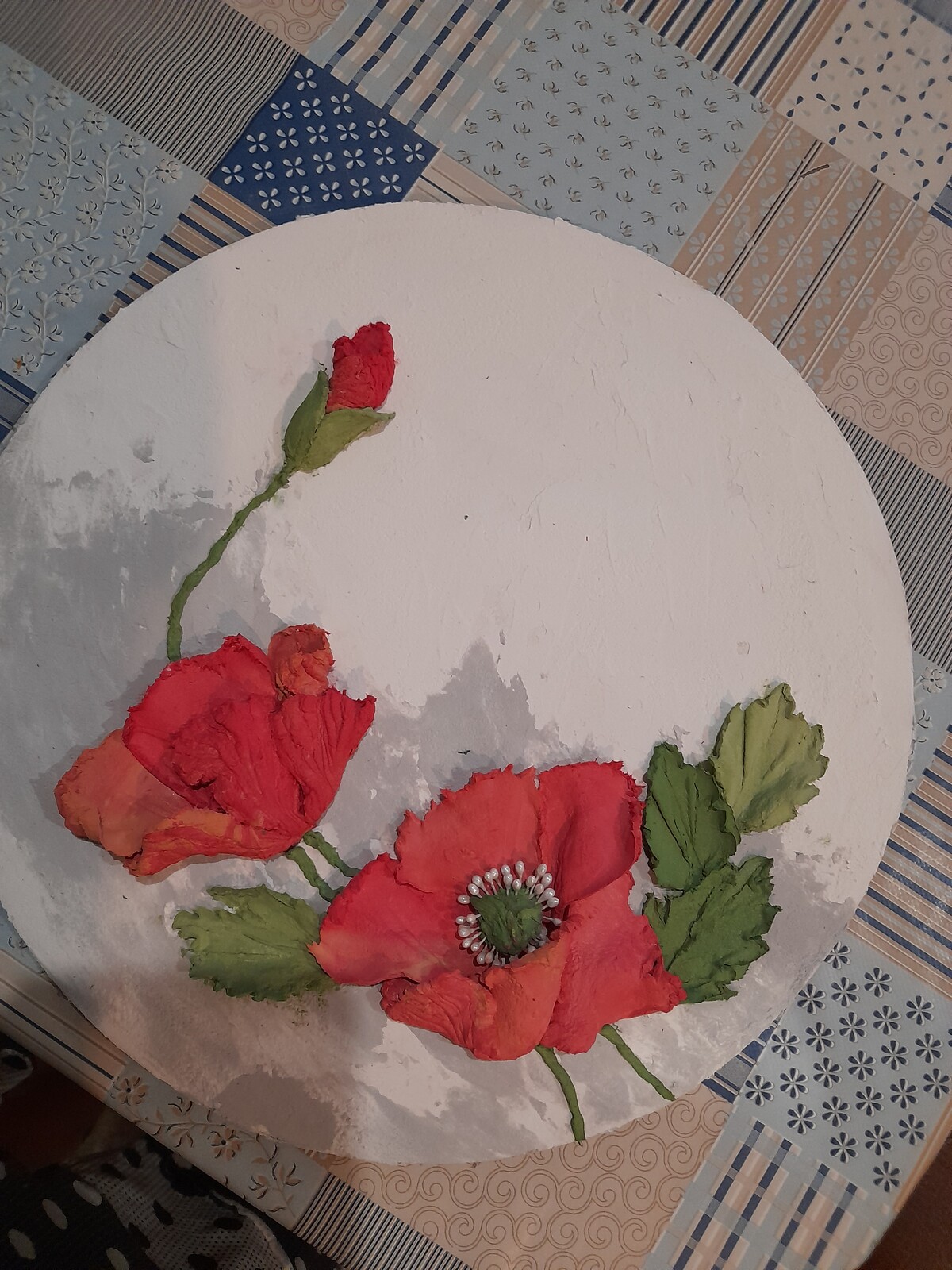 За несколько небольших уроков, мы создадим панно, представленное на изображении, научимся создавать объемные цветы мака в нескольких видах, стебли и листья и поймем, что скульптурной живописи может научиться абсолютно каждый.