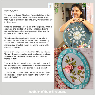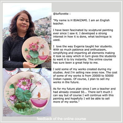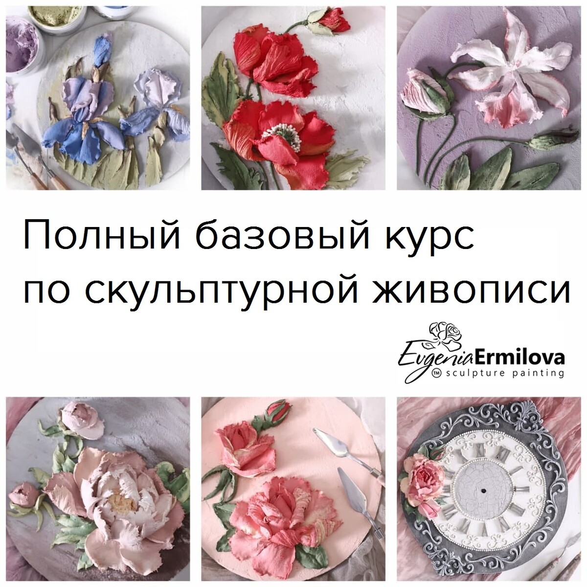 Бест-селлер. переведенный на 9 языков, по которому с 2018 года обучилось более 7000 человек из 29 стран. Обучение с нуля, умение рисовать не нужно. Студенты знакомятся с основами скульптурной живописи, а на практических занятиях выполняют 5 панно с разными видами цветов и настенные часы. Домашние задания у студентов принимает лично Евгения Ермилова. Курс построен по образовательной методике "План Келлера". Этот курс ориентирован на новичков в скульптурной живописи, которым достаточно базовых знаний в этой технике создания объемных изображений