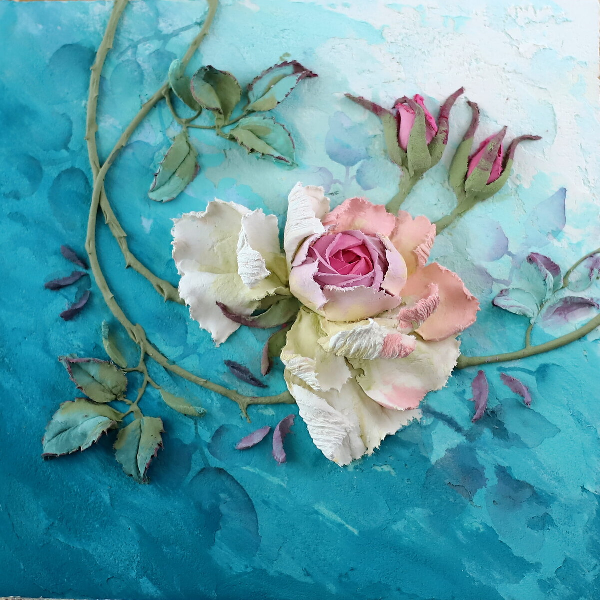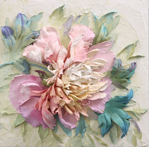 За несколько небольших уроков, мы создадим панно, представленное на изображении, научимся создавать элементарные объемные цветы в нескольких видах, стебли и листья и поймем, что скульптурной живописи может научиться абсолютно каждый.