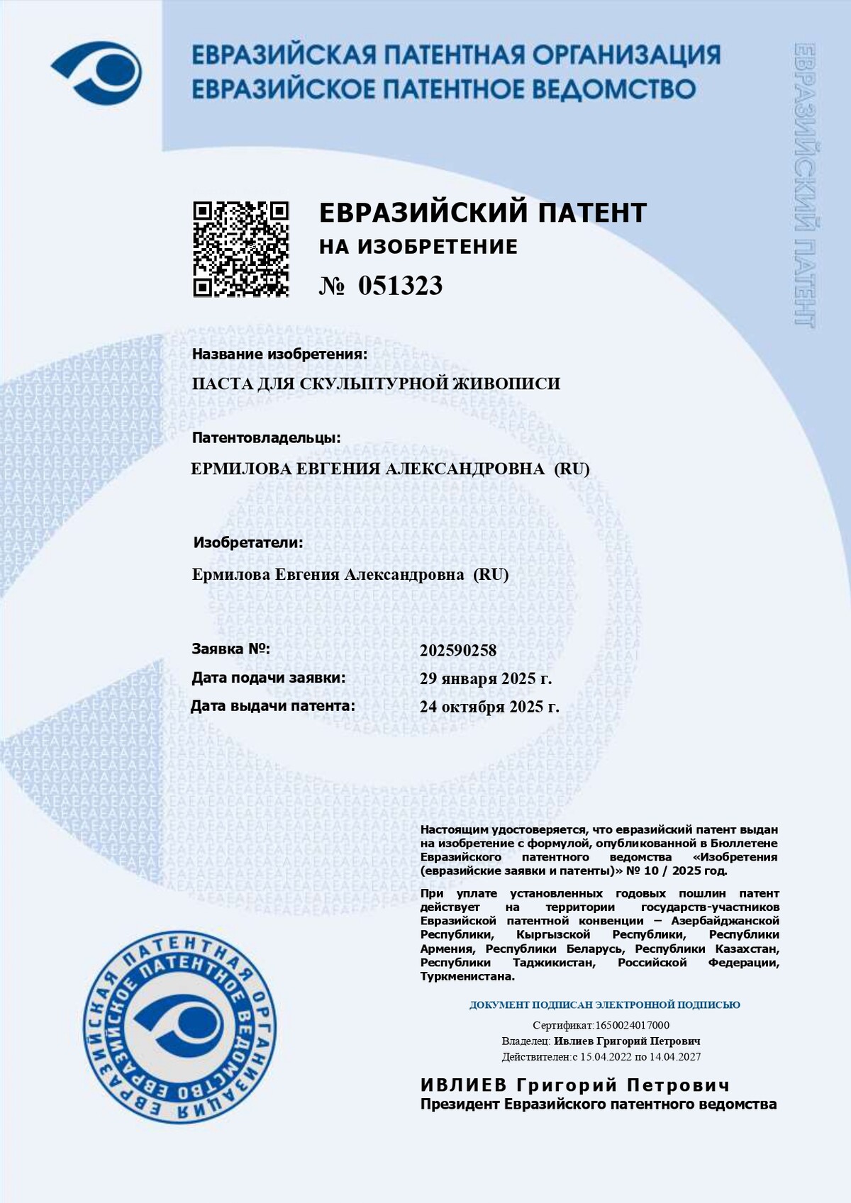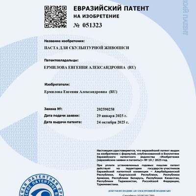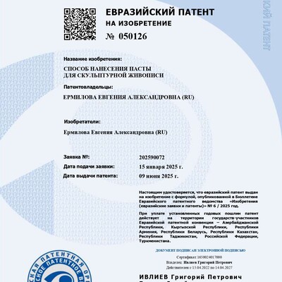 - Евгения - изобретатель уникального материала для творчества - текстурной пасты для скульптурной живописи - специальной акриловой пасты, позволяющей создавать объемные изображения высотой до 7 сантиметров (Евразийский патент № 051323)